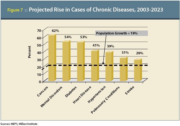 - A 2007 study reported that seven chronic diseases – cancer, diabetes, hypertension, stroke, heart disease, pulmonary conditions, and mental illness – have a total impact on the economy of $1.3 trillion annually. By the year 2023, this number is projected to increase to $4.2 trillion in treatment costs and lost economic output.